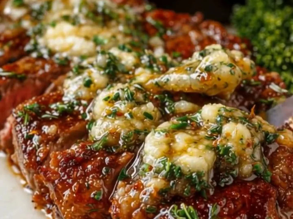 Pendant ce temps, ajoutez le mélange de beurre à l’ail sur le steak reposé, en veillant à bien enrober chaque partie.