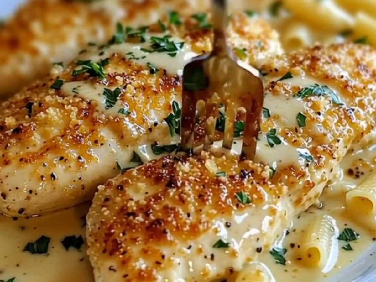 Tranchez les poitrines de poulet et disposez-les sur un lit de pâtes crémeuses. Décorez avec des feuilles de laitue romaine et des croutons si souhaité.