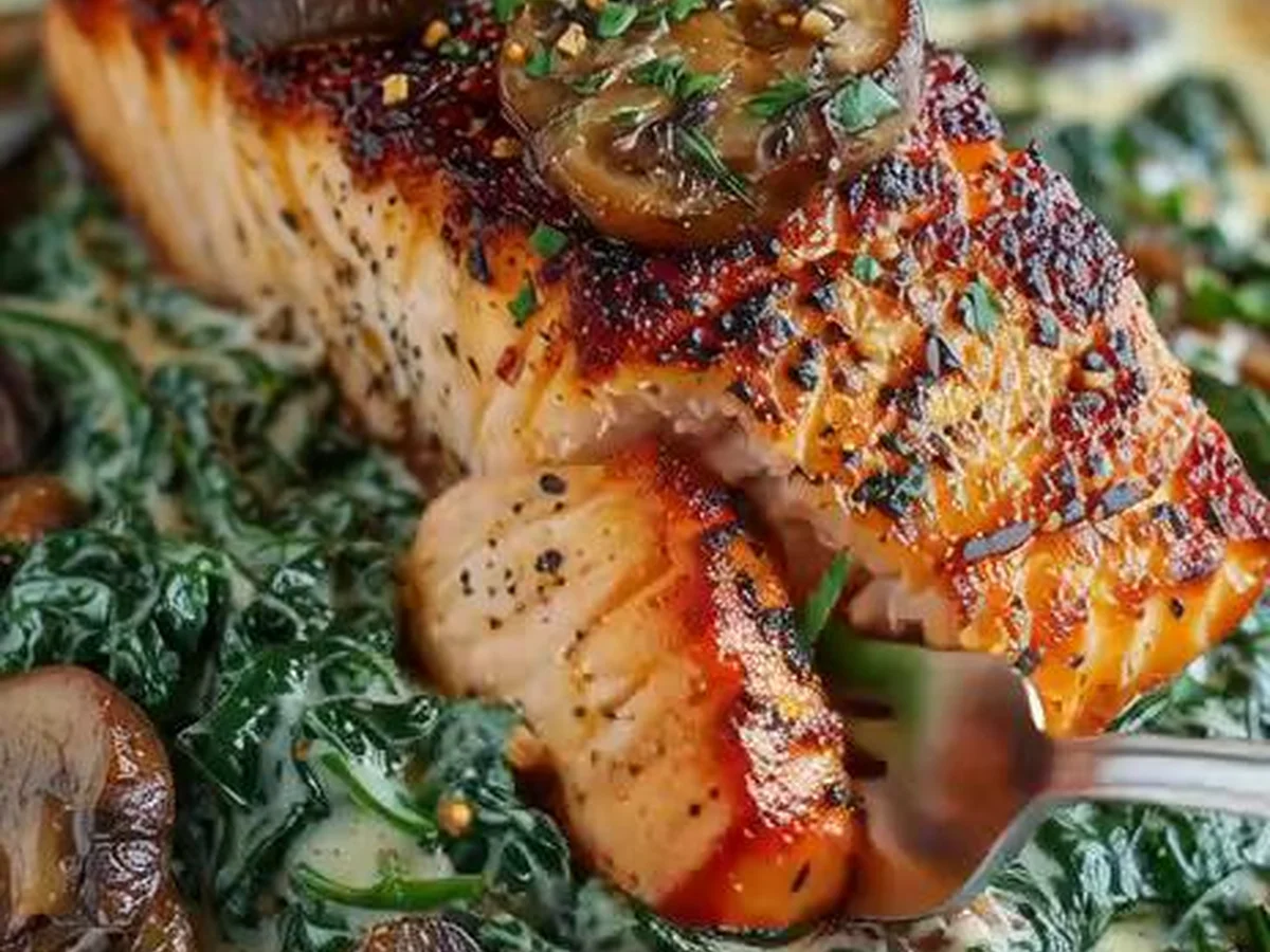 Dégustez votre délicieux Saumon crémeux à l’ail et au beurre avec épinards et champignons fait maison !
